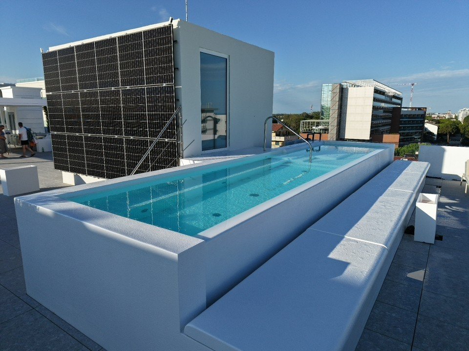 From this vision came Klimapool Floating, a patented system that has revolutionized the concept of elevated pools, enabling the creation of self-supporting, floating basins, fully prefabricated, without weighing on the load-bearing structures of buildings. A solution de­signed for terraces and slabs with limited load capacity, which guarantees safety, sustainability, and comfort at the same time.