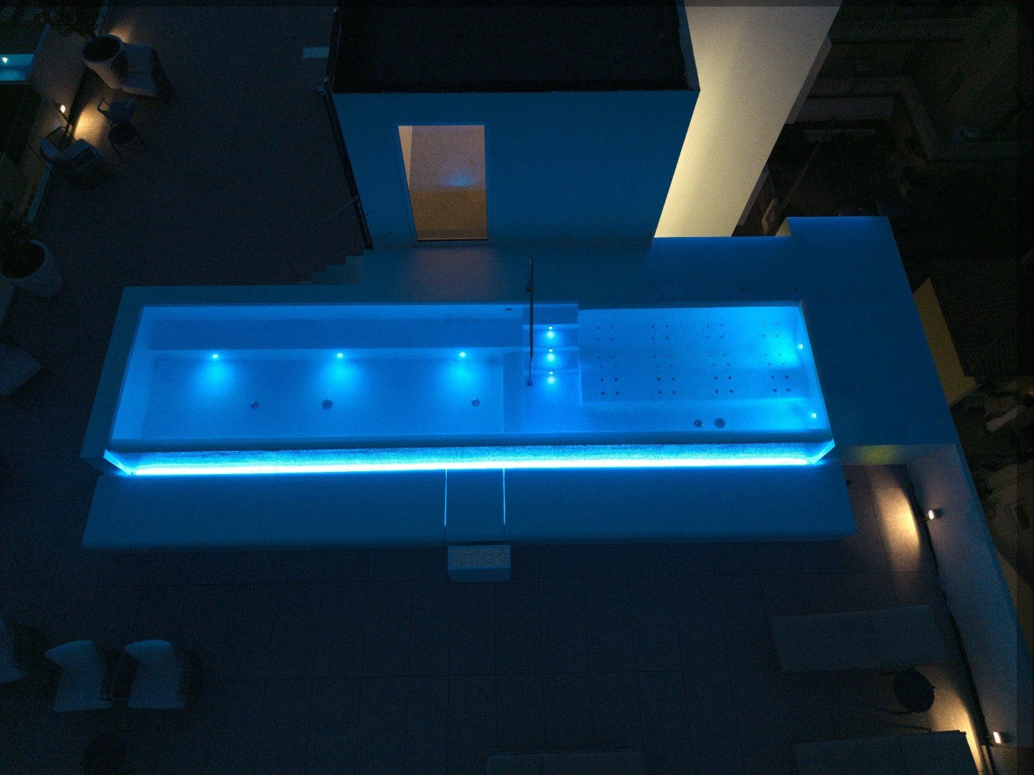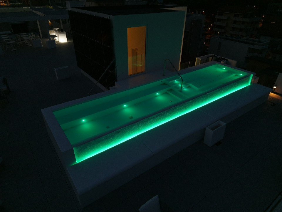 The RGB lighting system completes the work, creating evocative atmospheres that change throughout the day, turning the pool into a living space, both day and night.