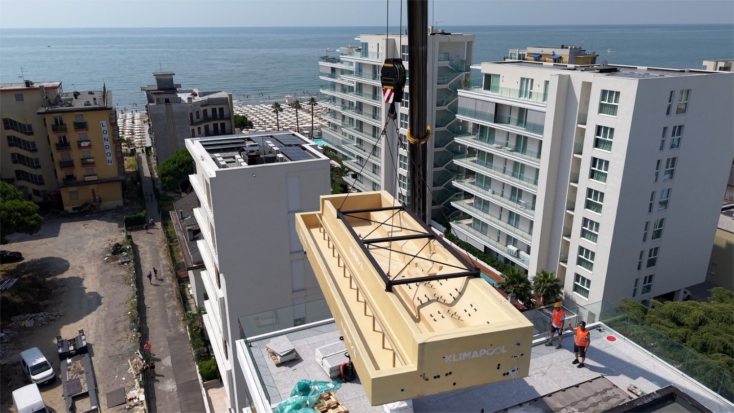 The project developed for the Beach Palace Hotel is a striking example. The pool, delivered in a single piece, was installed with a crane in less than an hour, without disturbing the hotel’s guests.
